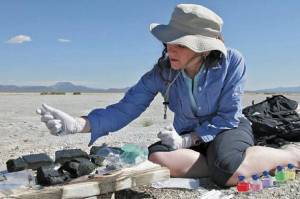 | Η Φελίσα Γουλφ-Σάιμον επιδεικνύει το βακτήριο GFAJ-1 στην όχθη της λίμνης Μόνο. Τα αρχικά του δεν παραπέμπουν σε χημικά στοιχεία, αλλά στο «Give Felisa Α Job» («Δώστε δουλειά στη Φελίσα») |