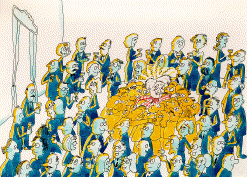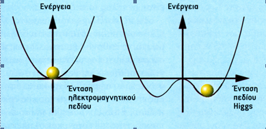 Ένα τυπικό πεδίο, όπως το Η/Μ, παρουσιάζει τη χαμηλότερή του ενέργεια όταν η ένταση του πεδίου μηδενίζεται (αριστερά). Το σύμπαν μοιάζει με μια μπάλα που αφού περιπλανήθηκε κυλώντας εδώ και εκεί μέσα στην κοιλάδα, κατέληξε τελικά να ηρεμήσει στον πυθμένα της – δηλαδή, έχει εγκατασταθεί σε σημείο μηδενικής έντασης πεδίου. Το Higgs, αντίθετα, παρουσιάζει την ελάχιστή του ενέργεια σε μη μηδενική ένταση πεδίου, οπότε η «μπάλα» καταλήγει να ηρεμήσει σε μη μηδενική τιμή. (δεξιά).
