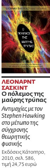 Το βιβλίο που έφθασε στο γραφείο μου ήταν σφιχτοδεμένο και παχύ, με σκληρό εξώφυλλο και όμορφη εικόνα στη φάτσα του περιτυλίγματός του. Ο τίτλος ήταν πολεμικά προκλητικός και ο υπότιτλός του έτι περισσότερον: Αντιμαχίες με τον Stephen Ηawking… Ποιος θρασύς προσπαθούσε να μοσχοπουλήσει θέτοντας εαυτόν αντίπαλο αντάξιο ενός Χόκινγκ; Στην πρώτη αριστερή σελίδα μάς πληροφορούσε ότι είναι μέλος δύο ακαδημιών των ΗΠΑ, της ΝΑS και της ΑΑΑS, όπως και καθηγητής έδρας της Θεωρητικής Φυσικής στο περιώνυμο Πανεπιστήμιο Στάνφορντ, αλλά- ήμαρτον, Κύριε- ο Σάσκιντ είναι ειδήμων στα στοιχειώδη σωματίδια και στην κβαντομηχανική! Πώς τολμάει να αντιπαρατίθεται με έναν Χόκινγκ σε θέματα κοσμολογικής κλίμακας;