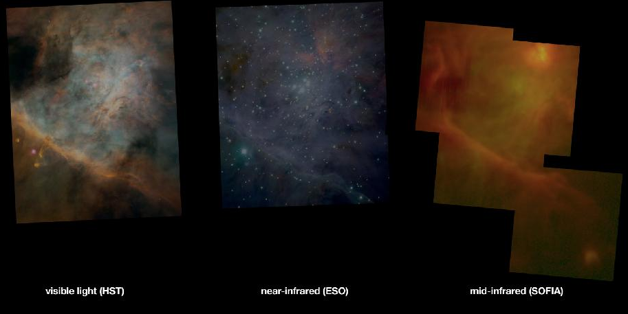 Εικόνα σε μέσο υπέρυθρο του Messier 42 από το SOFIA (δεξιά) σε σύγκριση με εικόνες από την ίδια περιοχή σε άλλα μήκη κύματος από το διαστημικό τηλεσκόπιο Hubble (αριστερά) και το European Southern Observatory (μέσον).
