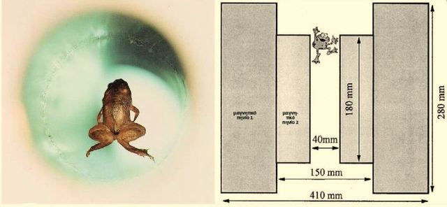 | «Πετάει, πετάει ο βάτραχος»: αριστερά, φωτογραφία από το πείραμα αιώρησης εμβίου του Αndre Geim και, δεξιά, διάγραμμα της διάταξης |