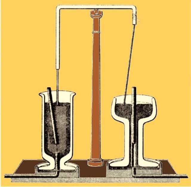 Τομή της διάταξης του ομοπολικού κινητήρα, με τον οποίο ο Faraday ξεκίνησε το 1821 τη Βιομηχανική Επανάσταση: υπό την επίδραση ηλεκτρικού ρεύματος ένας μαγνήτης βυθισμένος σε υδράργυρο κινείται περιστροφικά (αριστερά) και εξαναγκάζει σύρμα να κινηθεί επίσης περιστροφικά στο δεύτερο δοχείο (δεξιά)