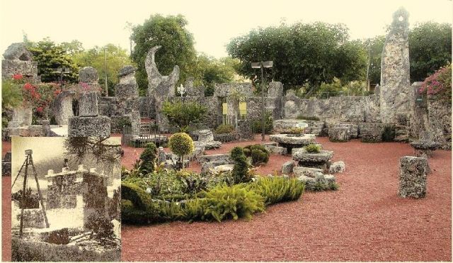 Το Coral Castle της Φλόριδας, με ένθετη τη φωτογραφία του απλοϊκού γερανού με τον οποίο υποτίθεται ότι μετακινήθηκαν ογκόλιθοι 30 τόνων