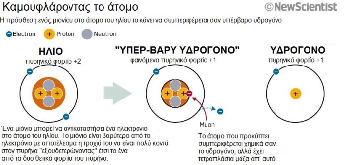 Ένα άτομο ηλίου αποτελείται από έναν πυρήνα που περιέχει δύο θετικά φορτισμένα πρωτόνια και δύο νετρόνια. Γύρω από τον πυρήνα περιστρέφονται δύο ηλεκτρόνια που φέρουν αρνητικό φορτίο. Ένα άτομο του υδρογόνου έχει μόνο ένα πρωτόνιο και ένα ηλεκτρόνιο. Ο Donald Fleming του Πανεπιστημίου της Βρετανικής Κολομβίας στο Βανκούβερ του Καναδά και οι συνεργάτες του, κατάφεραν να μεταμφιέσουν ένα άτομο ηλίου σε άτομο υδρογόνου αντικαθιστώντας ένα από τα ηλεκτρόνιά του με ένα μιόνιο, που είναι πολύ βαρύτερο από το ηλεκτρόνιο.