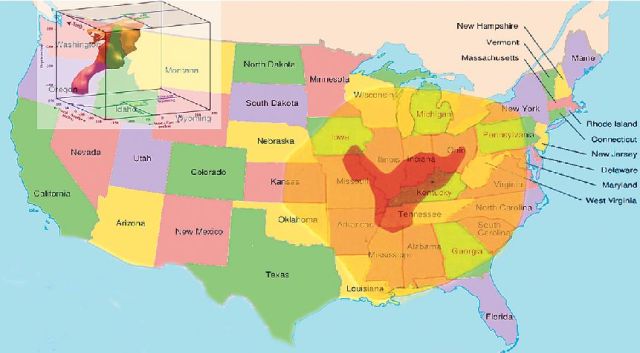 | Οι δύο εφιάλτες των ΗΠΑ: το υπόγειο ηφαίστειο του Yellowstone στα ΒΔ και το ρήγμα της Νew Μadrid στα ΝΑ (με πορτοκαλί, η ζώνη καταστροφών από σεισμό 6,8 ρίχτερ του 1895) |