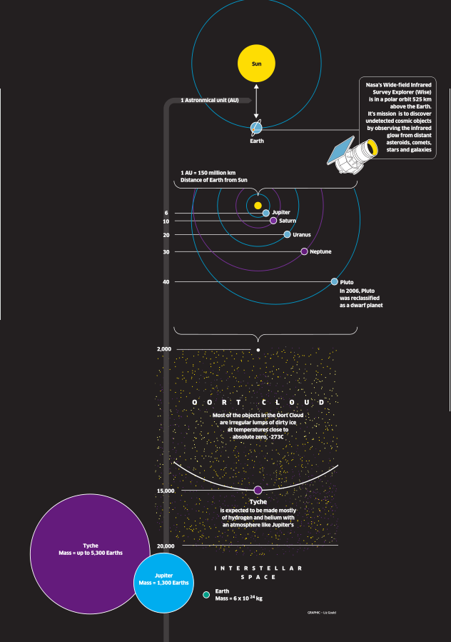 Αν η διαγραφή του Πλούτωνα από τους πλανήτες του ηλιακού μας συστήματος πριν από πέντε χρόνια εξέπληξε πολύ κόσμο, τότε η πιθανή αντικατάσταση του Πλούτωνα από έναν άλλο άγνωστο μέχρι τώρα πλανήτη και μεγαλύτερο σε μέγεθος από τον Δία θα είναι πολύ μεγαλύτερη έκπληξη.Οι αστρονόμοι θα αναζητήσουν τον πλανήτη Τύχη, έναν αέριο γίγαντα με τετραπλάσια μάζα από τον Δία, στην εξωτερική περιοχή του νέφους Oort, την πιο απομακρυσμένη περιοχή του ηλιακού μας συστήματος. Η τροχιά της Τύχης από τον Ήλιο θα είναι 15.000 φορές μεγαλύτερη από την τροχιά της Γης και 375 φορές μεγαλύτερη από την τροχιά του Πλούτωνα. Αυτός είναι και ο λόγος που δεν έχει παρατηρηθεί μέχρι σήμερα.