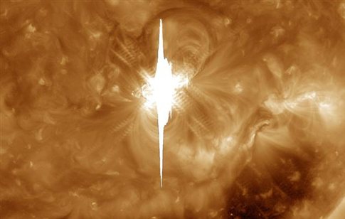 Η ηλιακή έκλαμψη που απειλεί τη Γη είναι η ισχυρότερη που έχει καταγραφεί τα τελευταία τέσσερα χρόνια. Εκτόξευσε στο Διάστημα ένα γιγάντιο σύννεφο πλάσματος (ιονισμένων σωματιδίων), του οποίου το μέτωπο έχει ήδη φτάσει στη Γη και διαταράσσει τις ραδιοεπικοινωνίες στη νότια Κίνα.