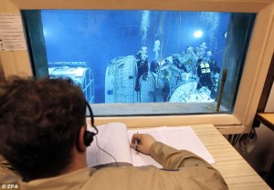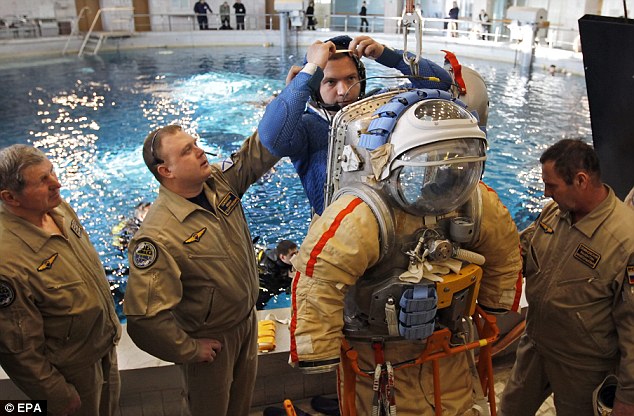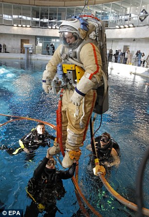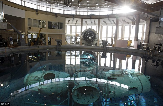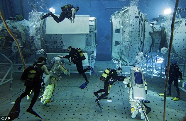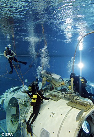 Η πισίνα είναι έχει το μέγεθος του διαστημικού σταθμού και έχει βάθος από 12 μέτρα, διάμετρο 23 μέτρα και όγκο 5.000 κυβικών μέτρων. Στη συνέχεια βλέπουμε διάφορα στιγμιότυπα από την εκπαίδευση…