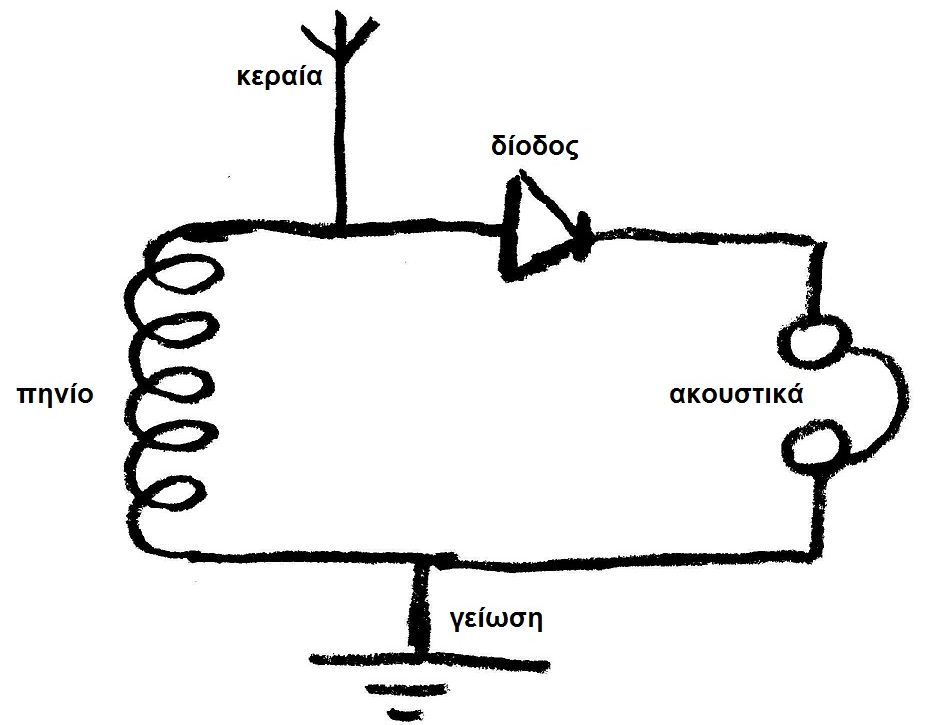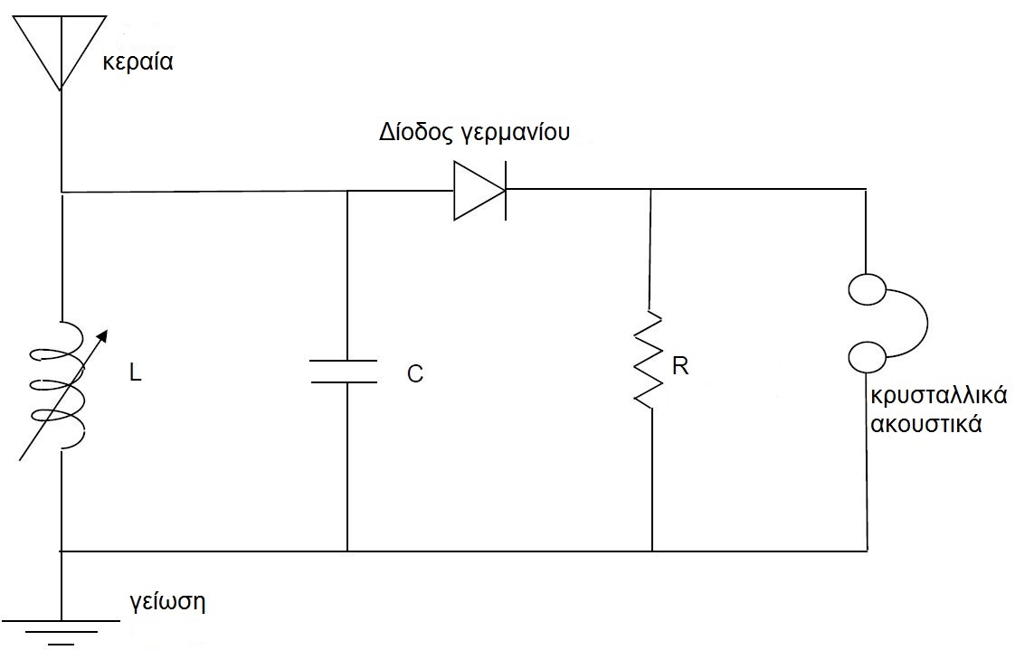 crystal_radioΓια κεραία πρέπει να χρησιμοποιήσουμε καλώδιο αρκετών μέτρων ή αν δεν έχουμε να χρησιμοποιήσουμε την κεραία της τηλεόρασης. Ως γείωση αρκεί πολλές φορές το σώμα μας.
