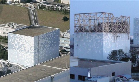 To κτίριο του αντιδραστήρα 1 πριν και μετά την έκρηξη του Σαββάτου. Στο εσωτερικό του, το πρωτεύον περίβλημα είναι πιθανώς ανέπαφο