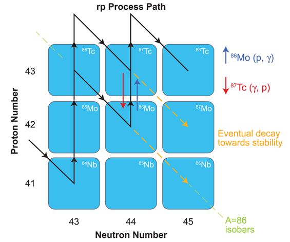 Η (πιθανή) διαδικασία rp στην περιοχή του πυρηνικού χάρτη όπου η ομάδα SHIPTRAP πραγματοποίησε τις μετρήσεις της. Η ισορροπία μεταξύ των πυρηνικών αντιδράσεων (p,γ) και των αντιστρόφων τους (γ,p) [(p,γ) = η σύλληψη πρωτονίου συνοδευόμενη από εκπομπή ακτινοβολίας γάμμα, (γ,p) = η φωτοδιάσπαση, όπου η ενέργεια απορροφάται (φωτόνιο γ) και εκπέμπεται ένα πρωτόνιο] – που δημιουργούν και καταστρέφουν το τεχνήτιο-87 αντίστοιχα, είναι ιδιαίτερα ευαίσθητη στις τιμές των μαζών των πυρήνων που συμμετέχουν. Οι νέες μετρήσεις από το SHIPTRAP μαζών – ιδιαίτερα του τεχνήτιου-87 και μολυβδενίου-86, δείχνουν ότι η φωτοδιάσπαση κυριαρχεί εμποδίζοντας την ροή των πυρηνικών αντιδράσεων προς τα πάνω και ενισχύει την διάσπαση βήτα προς τους πυρήνες με Α=86.