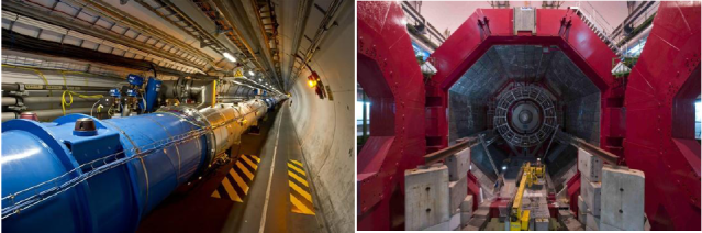 | Αριστερά: το τούνελ του LHC και ο σωλήνας της δέσμης πρωτονίων Δεξιά: ο ανιχνευτής του πειράματος ALICE, κατά την εγκατάστασή του στο CERN. |