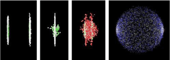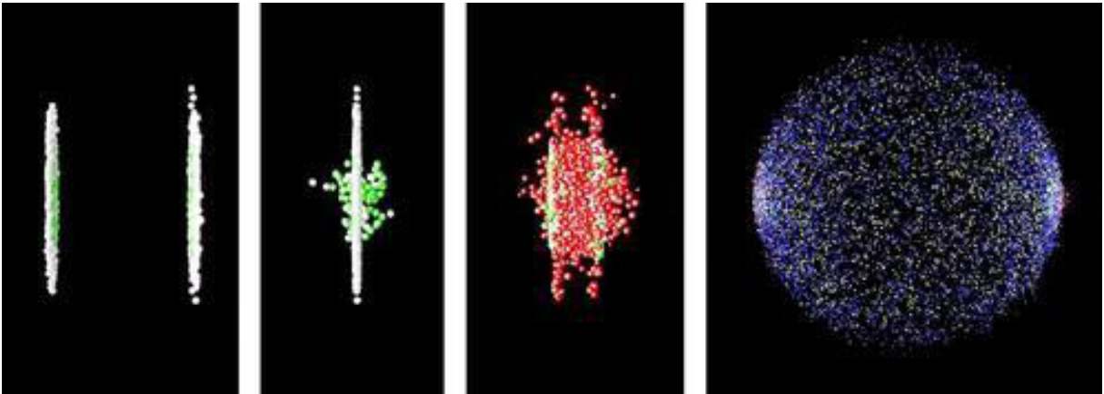 Διάφορα στάδια στην σύγκρουση δυο πυρήνων χρυσού. Από αριστερά: (α) οι πυρήνας, πλησιάζουν μοιάζοντας σαν τηγανίτες λόγω της σχετικιστικής συστολής Lorentz. (β) Γίνεται η πρόσκρουση και η ενέργειά τους αρχίζει να μετατρέπεται σε ισχυρά αλληλεπιδρώντα σωμάτια, (γ) Η καινούργια ύλη που δημιουργείται έρχεται σχεδόν ακαριαία σε θερμική ισορροπία και αρχίζει να διαστέλλεται αδιαβατικά. (δ) όταν η θερμοκρασία κατέβει κάτω από την κρίσιμη τιμή, το πλάσμα μετατρέπεται σε αδρόνια.