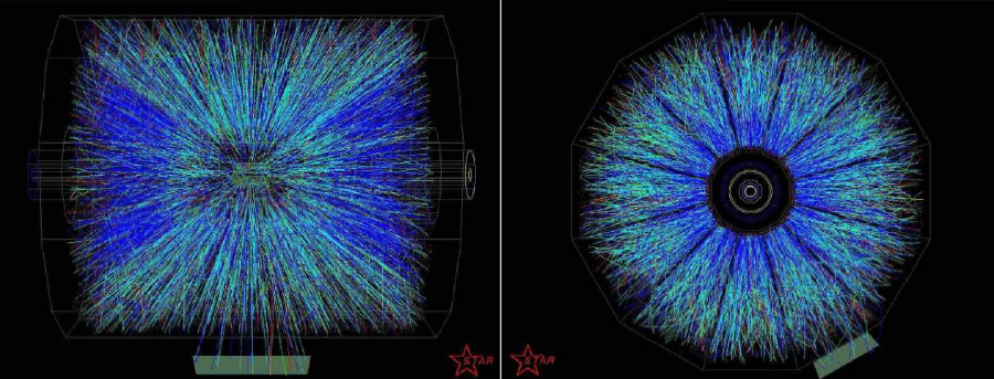 Σύγκρουση βαρέων ιόντων χρυσού στο RHIC, όπως καταγράφηκε από τον ανιχνευτή του πειράματος STAR. Φαίνονται οι τροχιές μόνο των φορτισμέων σωματιδίων, στην συντριπτική τους πλειοψηφία αδρόνια. Οι δυο φωτογραφίες είναι από τα πλάγια της δέσμης (αριστερά) και κάθετα στον αγωγό δέσμης (δεξιά). Το πείραμα καταφέρνει να αναγνωρίσει την πλειοψηφία των χιλιάδων σωματιδίων που καταγράφονται σε κάθε σύγκρουση.