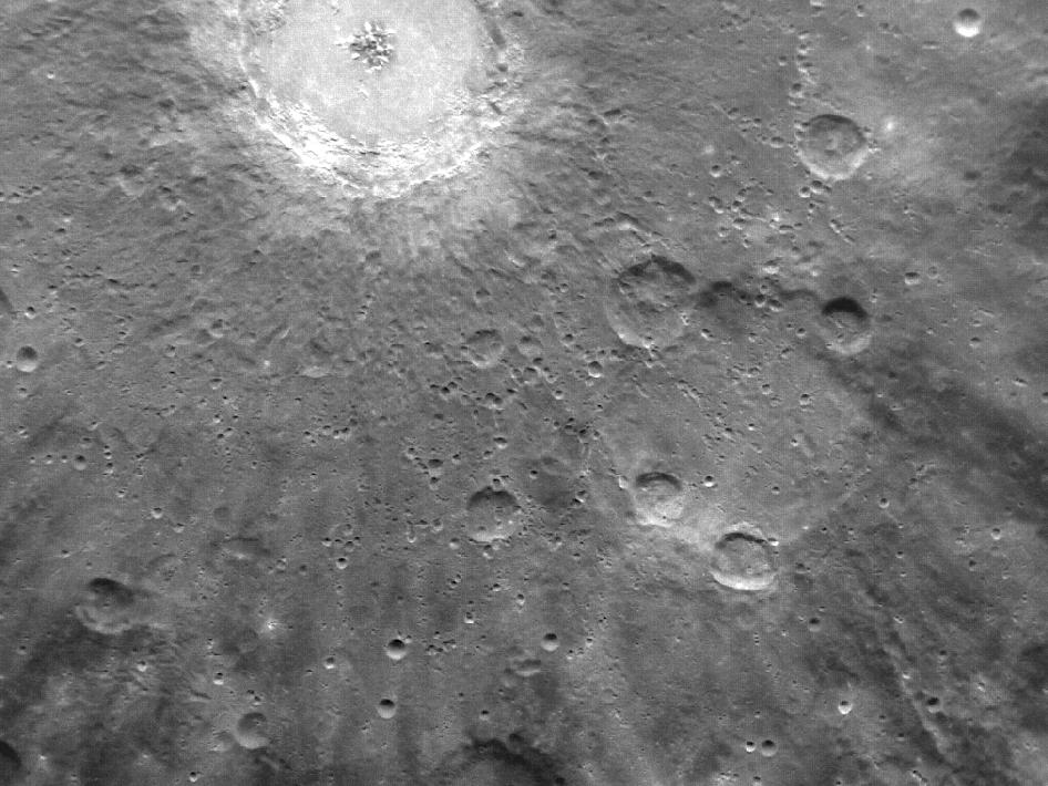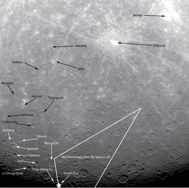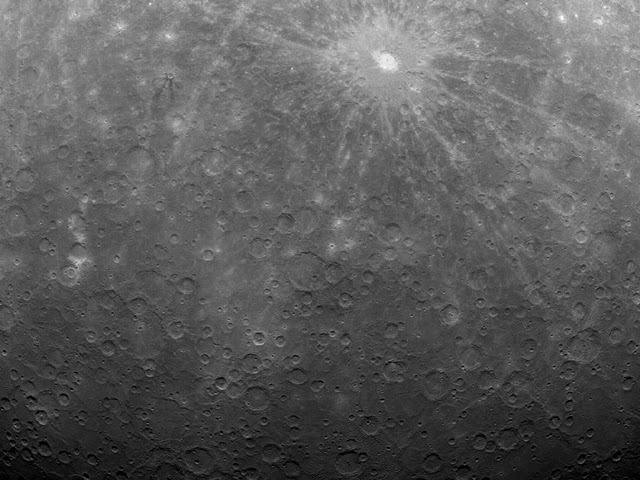 Αυτή η φωτογραφία της επιφάνειας του Ερμή ελήφθη από το MESSENGER από απόσταση 450 χιλιομέτρων πάνω από τον πλανήτη. Προκειται για την κοντινότερη προσέγγιση του διαστημικού σκάφους της NASA στον πλανήτη. Το MESSENGER είναι το πρώτο διαστημικό σκάφος που τέθηκε σε τροχιά γύρω από τον πλανήτη Ερμή.