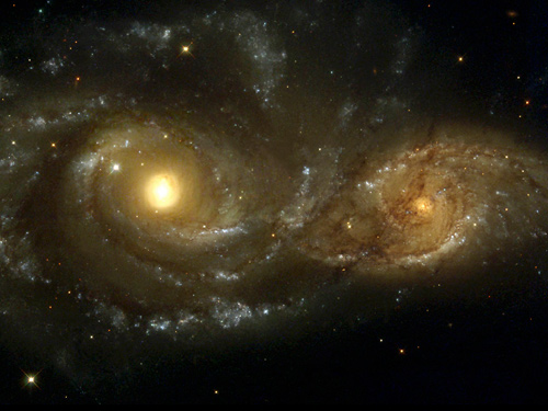 O μεγαλύτερος γαλαξίας (αριστερά) είναι ο NGC 2207 ο οποίος τελικά θα συγχωνευτεί με τον μικρότερο γειτονικό γαλαξία IC 2163 (δεξιά). Η σύγκρουση των δύο σπειροειδών γαλαξιών άρχισε πριν από 40 εκατομμύρια χρόνια. Ο γαλαξίας IC 2163 δεν έχει αρκετή ενέργεια ώστε να ξεφύγει από την βαρυτική έλξη του μεγαλύτερου γείτονα του και μετά από δισεκατομμύρια χρόνια από τώρα, θα υπάρχει μόνο ένας μόνο ένας γαλαξίας.