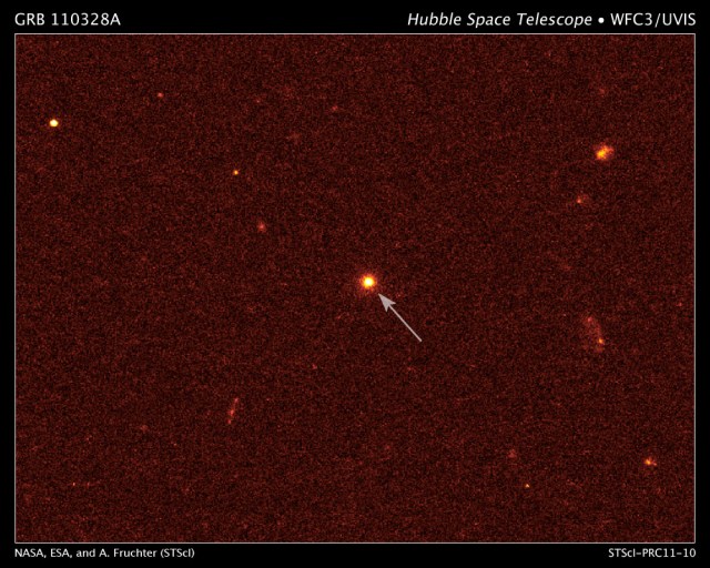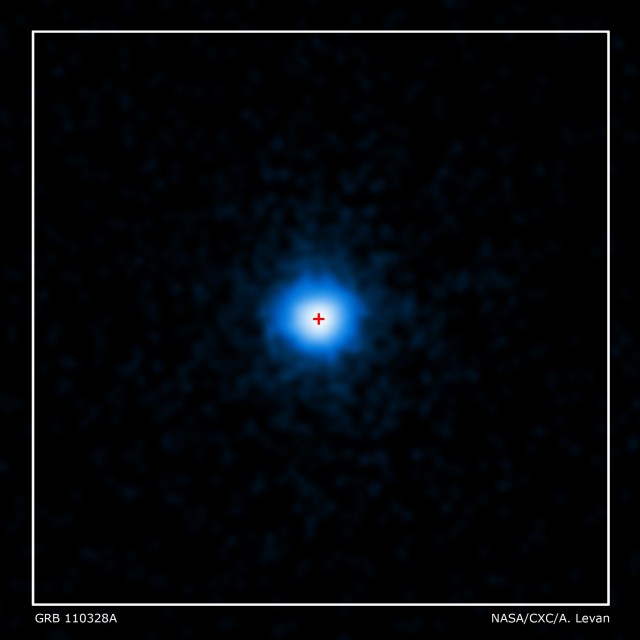 | Εικόνα από το Chandra. Η πηγή των ακτίνων Χ, GRB 110328A, βρίσκεται στο κέντρο του γαλαξία που φαίνεται στην προηγούμενη φωτογραφία του Hubble. |