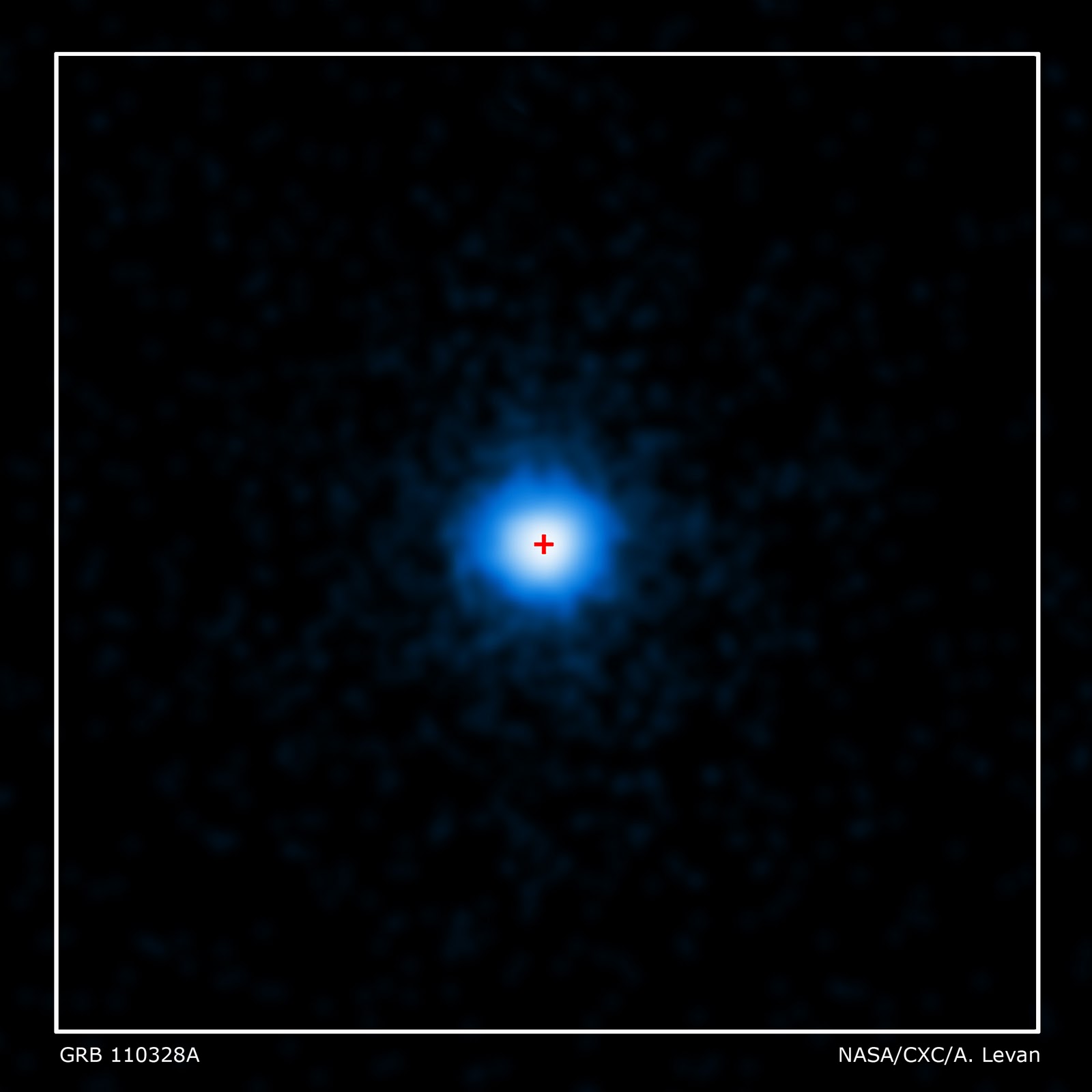 | Εικόνα από το Chandra. Η πηγή των ακτίνων Χ, GRB 110328A, βρίσκεται στο κέντρο του γαλαξία που φαίνεται στην προηγούμενη φωτογραφία του Hubble. |