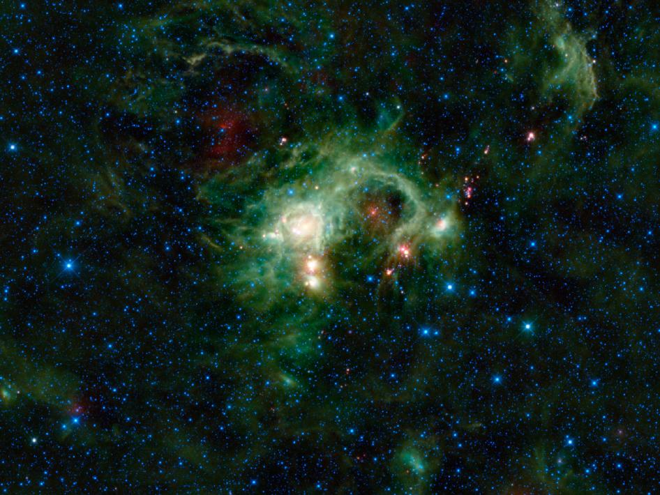 Ένα άλλο μυστηριώδες αντικείμενο που εμφανίζεται σ’ αυτή την εικόνα είναι το IRAS 05338 3447, το φωτεινό κόκκινο αντικείμενο στο κάτω δεξιά γωνία. Αυτό το αντικείμενο είχε θεωρηθεί από τον δορυφόρο IRAS (Infrared Astronomical Satellite), ως ένα δυσδιάκριτο φωτεινό σημείο. Η φωτογραφία του WISE δείχνει το αντικείμενο πολύ πιο καθαρά, αλλά δεν αποκαλύπτει άμεσα αν αυτό συνδέεται με την μεγαλύτερη περιοχή όπου σχηματίζονται άστρα. Στην φωτογραφία υπάρχουν επίσης αρκετά άστρα κόκκινου χρώματος τα οποία είναι πιθανόν άστρα – μωρά που περιβάλλονται από μεσοαστρική σκόνη, που εκπέμπει υπέρυθρο φως επειδή θερμαίνεται.