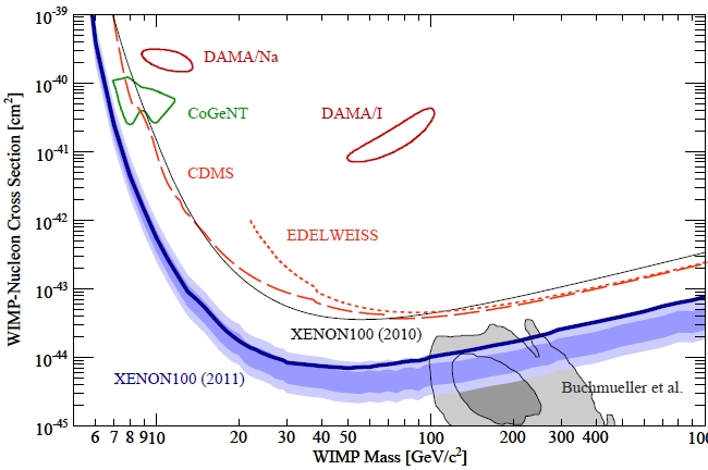 | Μπλε έντονη καμπύλη: Το όριο στην ενεργό διατομή της αλληλεπίδρασης των WIMPs με την κανονική ύλη συναρτήσει της μάζας όπως προέκυψε από το πείραμα XENON100 |