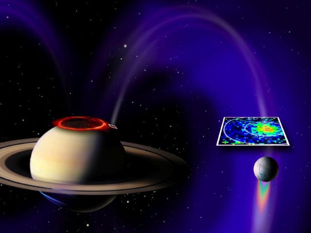 Η παραπάνω καλλιτεχνική απεικόνιση δείχνει ένα φωτεινό «μπάλωμα» από υπεριώδες φως κοντά στο βόρειο πόλο του Κρόνου που εμφανίζεται ως το «αποτύπωμα» της μαγνητικής σύνδεσης ανάμεσα στον Κρόνο και τον δορυφόρο του Εγκέλαδο…