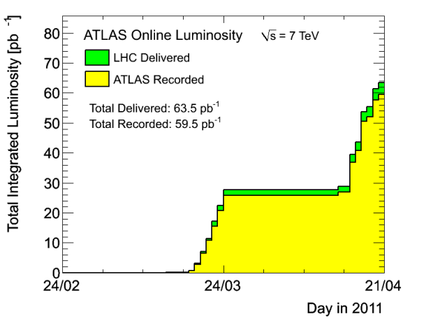 Στο σχήμα φαίνεται η συνολική ένταση που καταγράφηκε από το πείραμα ATLAS μέχρι στιγμής φέτος. Οι μονάδες σ’ αυτό το διάγραμμα είναι σε πικο-μπαρνς εις την μείον ένα (pb-1). [Το barn είναι μονάδα εμβαδού και 1b=10-28m2].