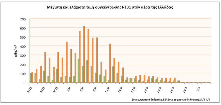 Όπως φαίνεται στο επισυναπτόμενο συγκεντρωτικό διάγραμμα των μετρήσεων ιωδίου στο ατμοσφαιρικό αερόλυμα, η φθίνουσα τάση των συγκεντρώσεων ραδιενέργειας ξεκίνησε εδώ και αρκετές εβδομάδες, ενώ από τις 28 Απριλίου και έπειτα προκύπτουν μη ανιχνεύσιμες τιμές.