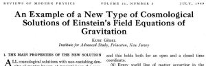 Το 1949 ο Kurt Gödel (Γκέντελ), προς τιμή των εβδομηκοστών γενεθλίων του Αϊνστάιν, παρουσίασε ένα άρθρο με λύσεις των εξισώσεων πεδίου του Αϊνστάιν στη ΓΘΣ. Οι λύσεις του παρήγαγαν θεωρητικά σύμπαντα στα οποία «δεν μπορούσε κανείς με τίποτε να υποθέσει αντικειμενική παρέλευση του χρόνου». Σ’ ένα τέτοιο κόσμο, ταξίδια στο χρόνο μέσα στο μέλλον ή στο παρελθόν είναι δυνατά με τον ίδιο ακριβώς τρόπο με τον οποίο μπορούμε να ταξιδεύουμε σε διαφορετικές διευθύνσεις στο χώρο. Στο σύμπαν του Γκέντελ, εγκαταλείπεται η διάκριση ανάμεσα σε νωρίτερα και αργότερα. Το ερώτημα είναι αν εάν μπορούμε, με βάση τα αποτελέσματα παρατηρήσεων, να αποκλείσουμε την πιθανότητα να είναι αυτό το μαθηματικά δυνατό σύμπαν υποψήφιο για το φυσικό σύμπαν……
