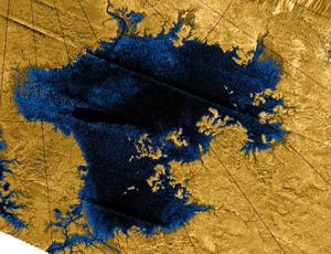 | Η θάλασσα Λιγεία στον Τιτάνα. Πρόκειται για μια λίμνη υδρογονανθράκων μήκους 400 χιλιομέτρων |