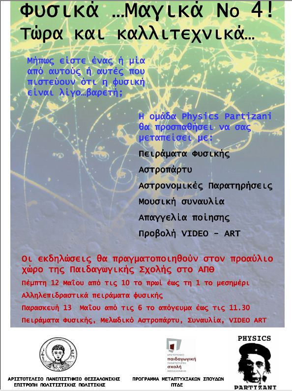 Μήπως πιστεύετε ότι η φυσική είναι λίγο ….βαρετή; Ότι απευθύνεται σε λίγους προικισμένους και ευφυείς ανθρώπους; Η ομάδα Physics Partizani – προπτυχιακοί και μεταπτυχιακοί φοιτητές/τριες του Τμήματος Φυσικής και του Παιδαγωγικού Τμήματος Δημοτικής Εκπαίδευσης του ΑΠΘ – θα προσπαθήσει να σας μεταπείσει. Θα παρουσιάσουν για τέταρτη φορά διάφορα αλληλεπιδραστικά πειράματα, που υπόσχονται, μεταξύ άλλων, να ξαφνιάσουν, να προβληματίσουν και να μαγέψουν…Όπλα τους είναι υλικά καθημερινής χρήσης, η φαντασία και η αγάπη τους για τη Φυσική.