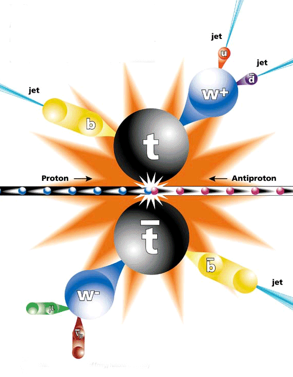 Όταν συγκρούονται πρωτόνια με αντιπρωτόνια παράγονται ζεύγη από κορυφαία κουάρκ (top quarks) (*) . Αυτό μπορεί να συμβεί μόνο όταν η ολική ενέργεια της σύγκρουσης είναι μεγαλύτερη από το διπλάσιο της μάζας του κορυφαίου κουάρκ. Επειδή το κορυφαίο κουάρκ είναι αρκετά βαρύ (περίπου 172 GeV), τέτοιες συγκρούσεις είναι πολύ σπάνιες – στην πράξη σε κάθε δέκα δισεκατομμύρια συγκρούσεις πρωτονίων-αντιπρωτονίων παράγεται ένα ζεύγος κορυφαίων κουάρκς. Έχοντας πολύ μεγάλη μάζα το κορυφαίο κουάρκ είναι πολύ εύκολο να διασπαστεί σε ένα μποζόνιο W και ένα χαμηλό-κουάρκ (b-quark ή bottom quark). Το b-κουάρκ παράγει έναν αδρονικό πίδακα(jet) – ένα προσανατολισμένο ρεύμα ενεργητικών αδρονίων. Το μποζόνιο W διασπάται σε ένα ζεύγος νετρίνων του ηλεκτρονίου ή σε ένα ζεύγος νετρίνων του μιονίου ή σε ένα ζεύγος νετρίνων ταυ ή ένα ζεύγος από quarks. Επειδή τα κουάρκς εμφανίζονται σε τρία χρώματα και υπάρχουν τρία δυνατά ζεύγη κουάρκς στα οποία το W μπορεί να αποσυντεθεί [ud (up-down) ή cs (charm-strange) ενώ κουάρκ της τρίτης γενιάς δεν εμφανίζονται λόγω της μεγάλης μάζας του κορυφαίου κουάρκ], υπάρχουν συνολικά έξι πιθανοί τρόποι διάσπασης ζευγών κουάρκς έναντι μόνο τριών λεπτονικών διασπάσεων, οπότε το δημοκρατικό μποζόνιο W επιλέγει με πιθανότητα ένα προς εννέα την κάθε μια….