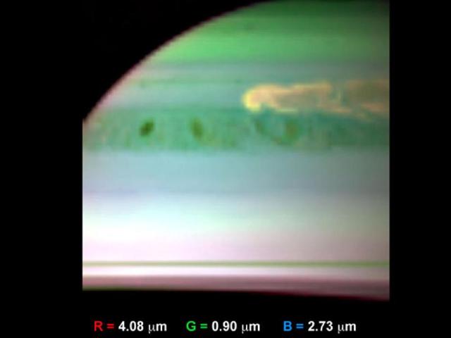 Η παραπάνω εικόνα υπέρυθρης ακτινοβολίας έχει ληφθεί από το διαστημικό σκάφος της NASA, Cassini. Τα χρώματα στην εικόνα έχουν τοποθετηθεί εκ των υστέρων και εκφράζουν μήκη κύματος του υπερύθρου φωτός που είναι αόρατο στο ανθρώπινο μάτι. Η καταιγίδα από νέφη αμμωνίας, στο βόρειο ημισφαίριο του Κρόνου, φαίνεται με το κίτρινο χρώμα.