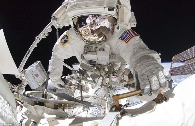 | O αστροναύτης του Εndeavour Greg Chamitoff έξω από τον Διεθνή Διαστημικό Σταθμό |