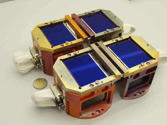 | Τέσσερις από τους 106 συνολικά ανιχνευτές CCD του Gaia, διακριτικής ικανότητας 8,8 megapixel ο καθένας. Δίπλα ένα νόμισμα των 2 ευρώ ως μέτρο σύγκρισης |