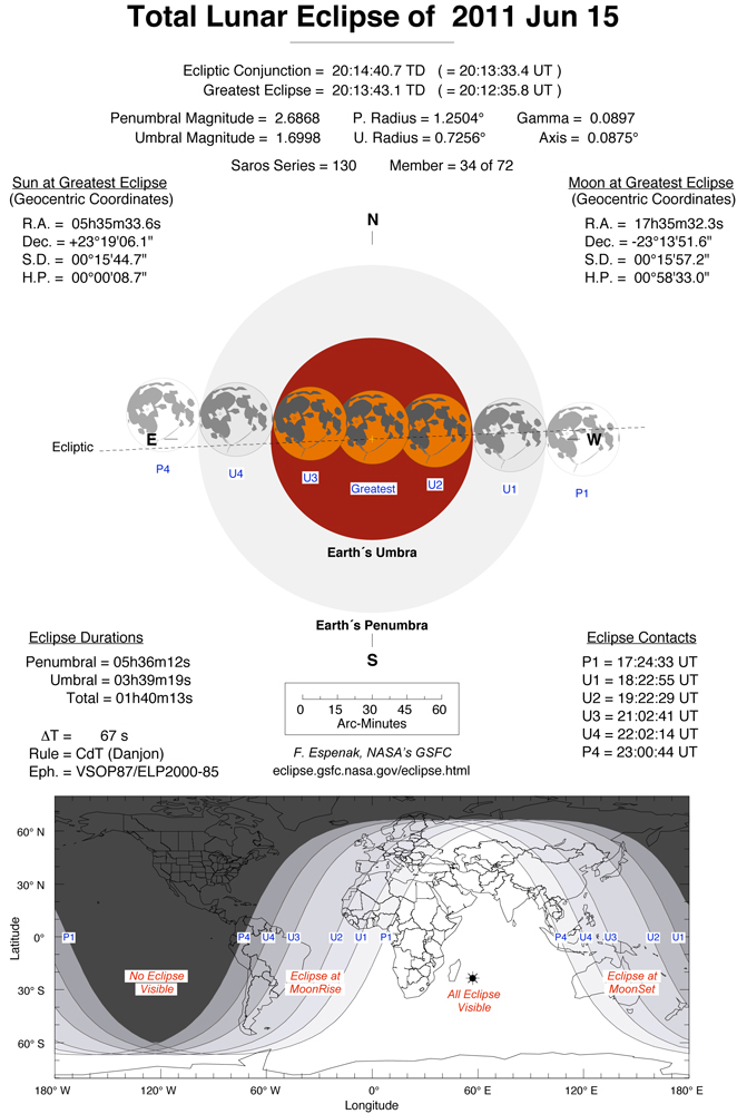 Σ' αυτό το γράφημα της NASA βλέπουμε τις ώρες έναρξης, κορύφωσης και λήξης της ολικής έκλειψης στις 15 Ιουνίου 2011, καθώς και τις περιοχές της Γης που θα είναι ορατή