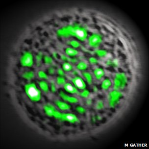 | Το ζωντανό λέιζερ στο μικροσκόπιο. Τα ακανόνιστα φωτεινά σχήματα εξαρτώνται από την εσωτερική δομή του κυττάρου |