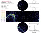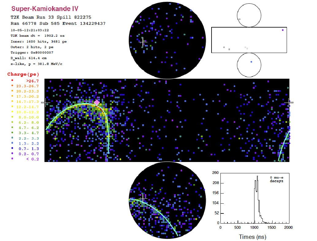 Σ’ αυτό το γράφημα μιας τομής του Super-Kamiokande, κάθε χρωματιστή κουκίδα δείχνει έναν φωτοπολλαπλασιαστή που ανιχνεύει φως (αυτοί οι φωτοπολλαπλασιαστές τοποθετούνται στο εσωτερικό τοίχωμα του ανιχνευτή). Τα νετρίνα του ηλεκτρονίου αλληλεπιδρούν με το νερό στον ανιχνευτή και παράγουν ηλεκτρόνια, τα οποία στη συνέχεια προκαλούν ηλεκτρομαγνητική «χιονοστιβάδα» δημιουργώντας τελικά ακτινοβολία Cherenkov που ανιχνεύεται σε σχήμα δαχτυλιδιού.
