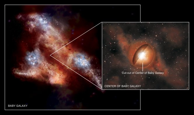 | Καλλιτεχνική απεικόνιση που δείχνει έναν πολύ νέο γαλαξία στις απαρχές του Σύμπαντος – λιγότερο από ένα δισεκατομμύριο χρόνια μετά το Big Bang. Στις περιοχές με μπλε χρώμα δημιουργούνται άστρα με πολύ γρήγορο ρυθμό. Ο πυρήνας του γαλαξία καλύπτεται από πυκνό πέπλο σκόνης και αερίων. Η ένθετη εικόνα δείχνει ότι στο κέντρο του γαλαξία παράγεται μια πολύ έντονη ακτινοβολία – που καλύπτει η σκόνη και τα αέρια – εξαιτίας της ταχύτατα αναπτυσσόμενης υπερμεγέθους μαύρης τρύπας. |