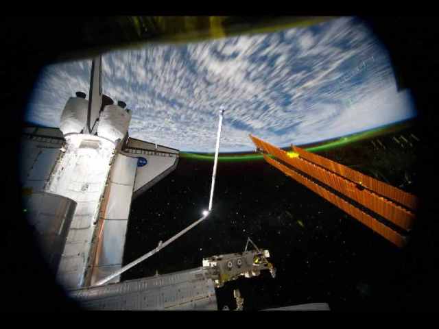 Σ’ αυτή την πανοραμική θέα από τον Διεθνή Διαστημικό Σταθμό, βλέπουμε αγκυροβολημένο το διαστημικό λεωφορείο Ατλαντίς, τμήμα του σταθμού και το νότιο ημισφαίριο. Παρατηρήστε το νότιο σέλας (Aurora Australis) και τα άστρα στο βάθος…..