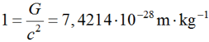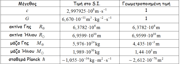Στη Γενική Θεωρία της Σχετικότητας* είναι βολικό να χρησιμοποιούμε ένα σύστημα μονάδων στο οποίο η σταθερά στης παγκόσμιας έλξης G=6,67×10‒11 kg•m3•s‒2 και η ταχύτητα του φωτός c=3•108 m/s, θεωρούνται αδιάστατα μεγέθη και είναι ίσα με τη μονάδα G=c=1