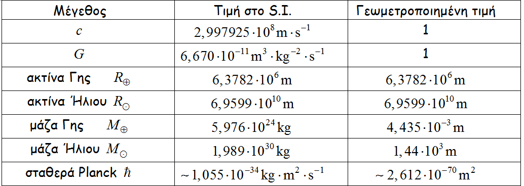Έτσι προκύπτουν οι λεγόμενες γεωμετροποιημένες μονάδες. Στο σύστημα αυτό όλες οι φυσικές ποσότητες αποκτούν διαστάσεις [μήκος] n, όπως για παράδειγμα η μάζα που μετρείται σε μέτρα!!