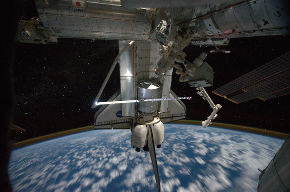 | Το Αtlantis φεύγει από τον Διεθνή Διαστημικό Σταθμό. Η φωτογραφία είναι του αστροναύτη Ron Garan από τον ΔΔΣ |