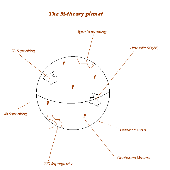 Η θεωρία Μ είναι παρόμοια περίπτωση. Όσο διαφορετικές και αν φαίνονται οι επιμέρους θεωρίες στην θεωρία Μ, όλες μπορούν να θεωρηθούν ως όψεις της ίδιας υποκείμενης θεωρίας. Πρόκειται για εκδοχές της θεωρίας εφαρμόσιμες μόνο σε ένα περιορισμένο φάσμα υποπεριπτώσεων – για παράδειγμα, όταν κάποιες ποσότητες, όπως η ενέργεια, λαμβάνουν μικρές τιμές. Όπως και οι αλληλοεπικαλυπτόμενοι χάρτες της μερκατορικής προβολής, οι διαφορετικές εκδοχές στις περιοχές που επικαλύπτονται θα προβλέπουν τα ίδια φαινόμενα. Αλλά όπως δεν υπάρχει επίπεδος χάρτης ο οποίος να αποτελεί καλή αναπαράσταση της συνολικής επιφάνειας της Γης, έτσι δεν υπάρχει και μια μοναδική θεωρία που να αναπαριστά ικανοποιητικά όλες τις παρατηρήσεις μας σε κάθε δυνατή κατάσταση…..