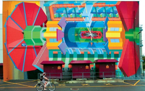 | Γκράφιτι. Tη μονοτονία του περιβάλλοντος του CERN διασπά μια υπέροχη πολύχρωμη τοιχογραφία που απεικονίζει τον ανιχνευτή. |