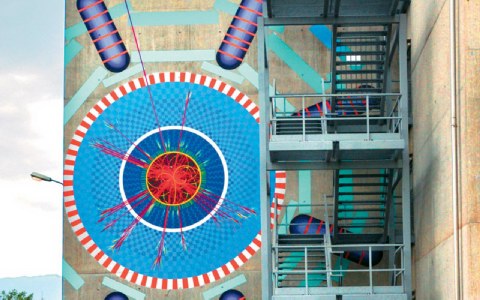 | Γκράφιτι. Tη μονοτονία του περιβάλλοντος του CERN διασπά μια υπέροχη πολύχρωμη τοιχογραφία που απεικονίζει τον ανιχνευτή. |