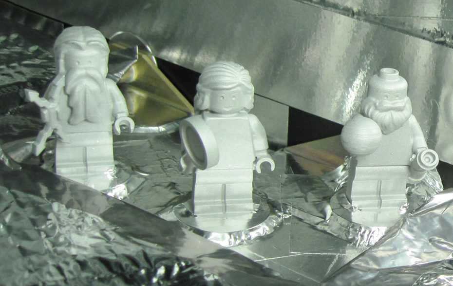 Στο εσωτερικό του διαστημικού σκάφους έχουν τοποθετηθεί συμβολικά τρία αγαλματίδια LEGO.