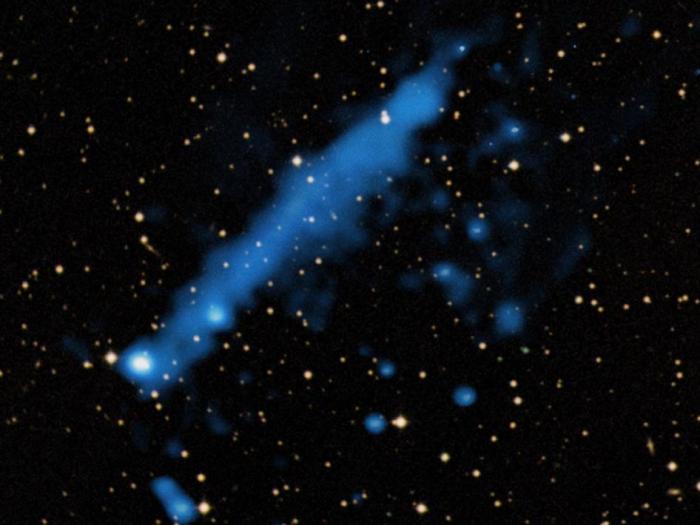 Αστρονόμοι χρησιμοποιώντας το τηλεσκόπιο ακτίνων Χ Chandra της NASA διαπίστωσαν ότι το πάλσαρ, γνωστό και ως PSR J0357 3205 (ή εν συντομία PSR J0357), διαθέτει μια μεγάλη ουρά, που εκπέμπει ακτινοβολία Χ. Αυτή η σύνθετη εικόνα δείχνει τα δεδομένα του Chandra με μπλε χρώμα και τα ψηφιοποιημένα δεδομένα του Sky Survey με κίτρινο χρώμα. Η θέση του πάλσαρ βρίσκεται στο επάνω δεξιό άκρο της ουράς. Οι δύο φωτεινές πηγές που βρίσκονται κοντά στο κάτω αριστερό άκρο της ουράς, πιστεύεται ότι είναι άσχετα αντικείμενα υποβάθρου που βρίσκονται έξω από τον γαλαξία μας. Το PSR J0357 ανακαλύφθηκε από το διαστημικό τηλεσκόπιο ακτίνων γάμα Fermi το 2009. Οι αστρονόμοι υπολογίζουν ότι το πάλσαρ βρίσκεται περίπου 1.600 έτη φωτός από τη Γη και η ηλικία του είναι περίπου μισό εκατομμύριο χρόνια – πρόκειται δηλαδή για ένα μέσης ηλικίας πάλσαρ.