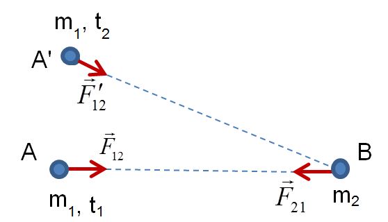 Τα σώματα m1 και m2 βρίσκονται στις θέσεις Α και Β τη χρονική στιγμή t1. Τη χρονική στιγμή t2 το σώμα m1 έχει μετατοπιστεί στη θέση Α’. Έστω ότι η ταχύτητα μετατόπισης του σώματος m1 είναι υ και αυτή της μετάδοσης της αλληλεπίδρασης είναι c (πεπερασμένη). Προφανώς αν