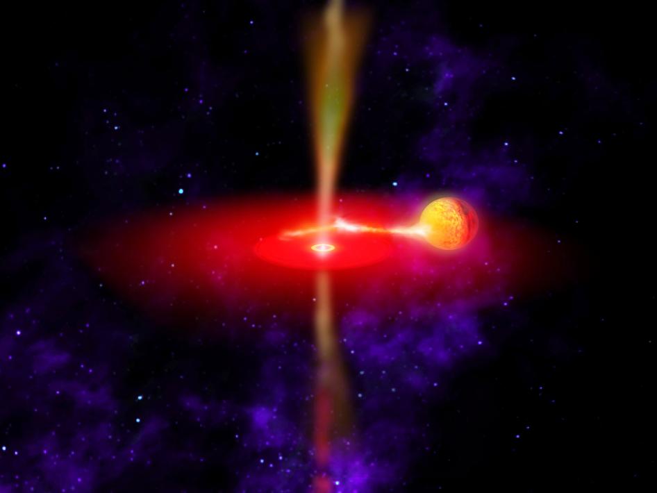 Περιβάλλεται από ένα δίσκο προσαύξησης (κόκκινο) από το «ρούφηγμα» της ύλης γειτονικού άστρου (κίτρινο). Μέρος από το υλικό αυτό εκτινάσσεται μακριά στην μορφή πιδάκων ( jets) (το κίτρινο που ρέει πάνω και κάτω από το δίσκο). Η περιοχή που βρίσκεται κοντά στη μαύρη τρύπα λάμπει έντονα στο υπέρυθρο φως.