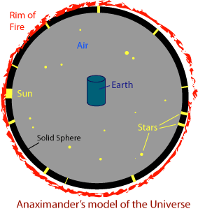 Σύμφωνα με τον Αναξίμανδρο, ο κόσμος όπως τον γνωρίζουμε προήλθε από μια αιώνια, και αιωνίως κινούμενη, ποιοτικά και ποσοτικά απροσδιόριστη πρώτη ύλη, το άπειρον, μέσω μιας διαδικασίας διαδοχικών σταδίων…..